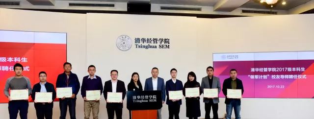 ![]() 清华经管学院2017级本科生“领军计划”校友导师聘任仪式举行发布日期:2017-11-06 2017年10月22日上午,清华经管学院2017级本科生“领军计划”校友导师聘任仪式在学院举行,61位优秀校友导师获聘。清华经管学院党委副书记焦捷教授、学院学生工作组组长高峰教授、校友发展中心主任王海涛老师、教学办公室执行主任乔蓉老师以及100多位2017级本科新生、转系生参加了活动。活动由高峰教授主持。 高峰教授逐一介绍了全部受聘校友导师后,焦捷教授为到场的2017级本科生“领军计划”校友导师颁发了聘任证书。